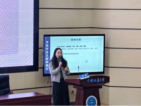 会议伊始,徐媛系统梳理了学院近三届毕业生在考研、保研、出国出境、企业就业及公考等方面的发展路径与数据趋势。她指出,大三阶段是“学业追赶、规划确定、成果积累”的关键期,提醒同学们尽早明确方向,结合专业特色与个人优势做出理性选择。