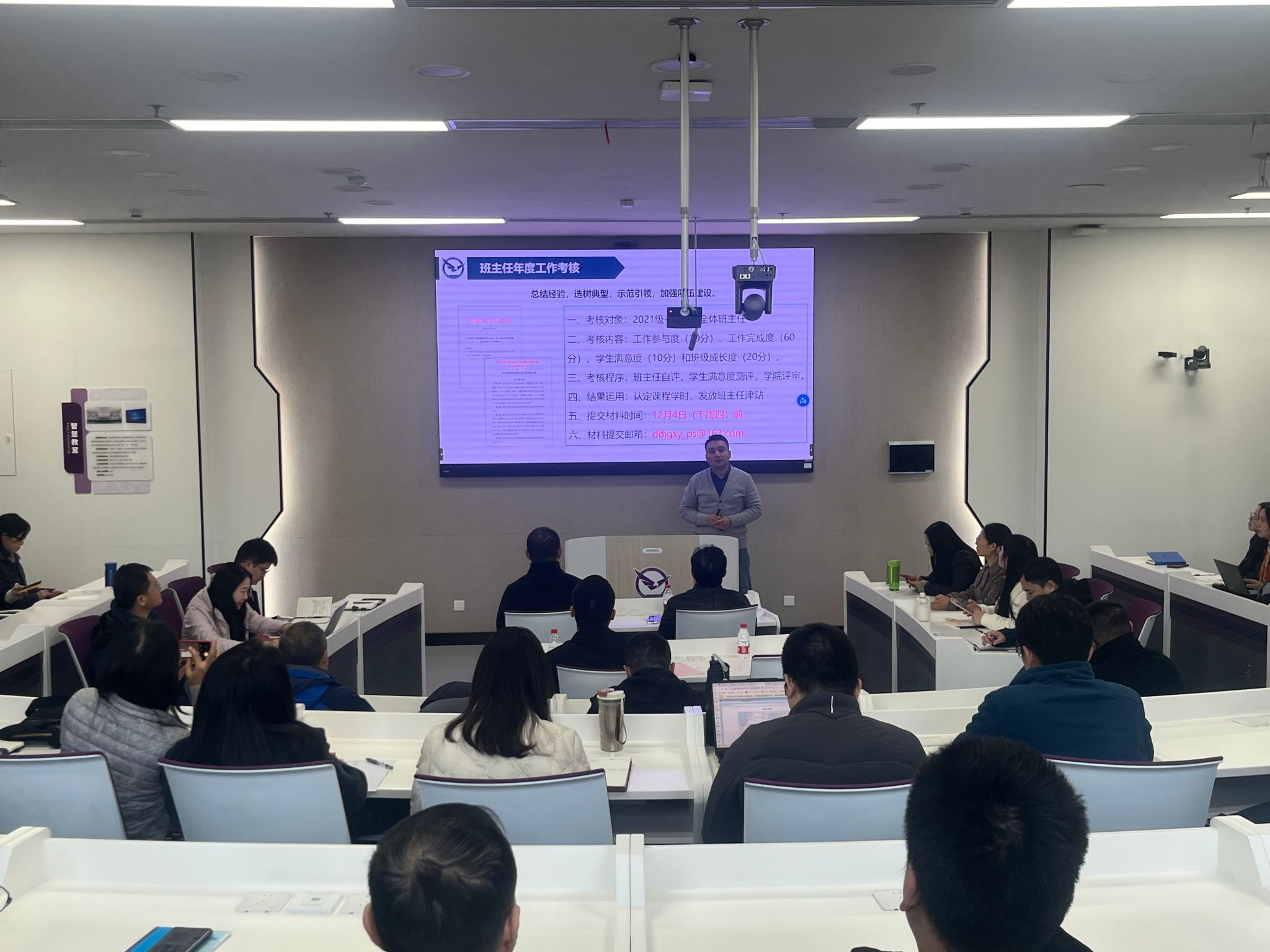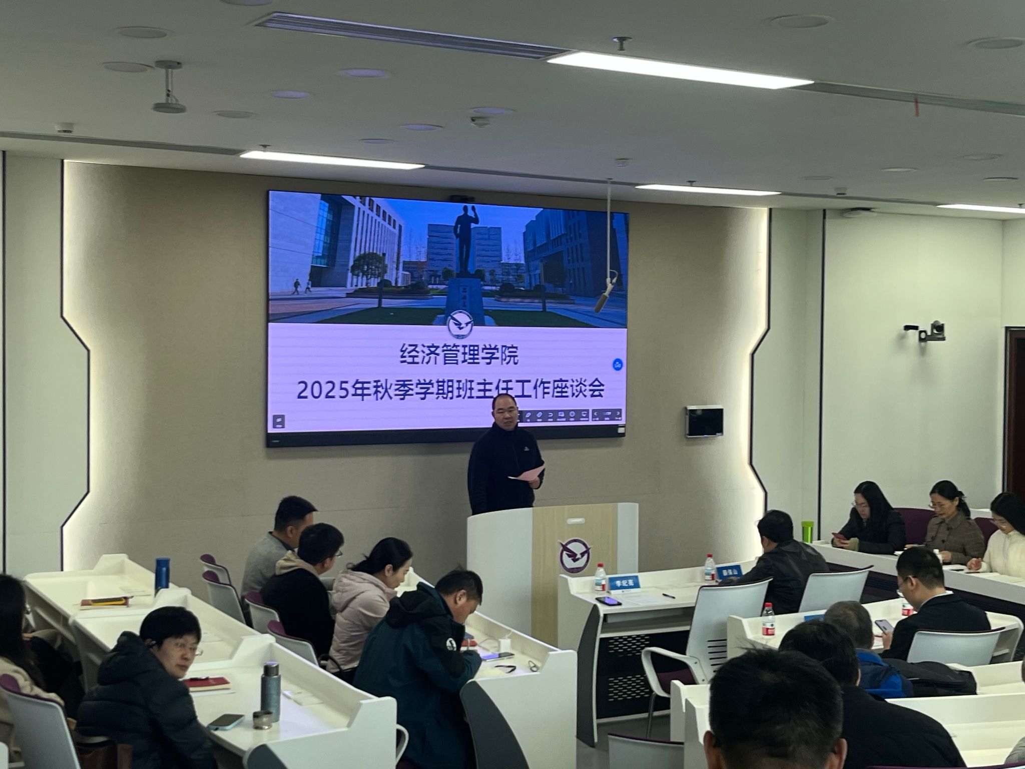 11月27日下午,澳门彩票有限公司 于崇信楼108智慧教室召开2025年秋季学期班主任工作座谈会。学院党委书记薛保山、党委副书记李纪亮出席会议,全体班主任及辅导员参加。会议由学院党委副书记李纪亮主持。